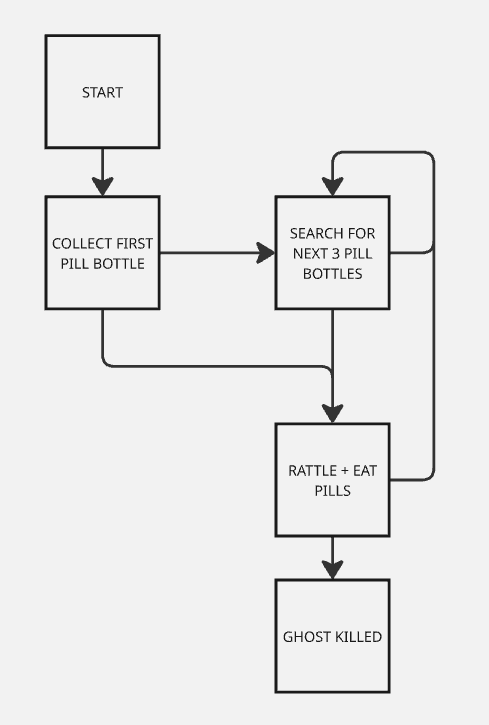 You play as a rattler, a person whose profession is exterminating stillaumbras - spectral creatures that appear across city sewers. The goal is to kill the ghost by rattling your medication. Stay alive by eating your medication and avoiding the ghost.